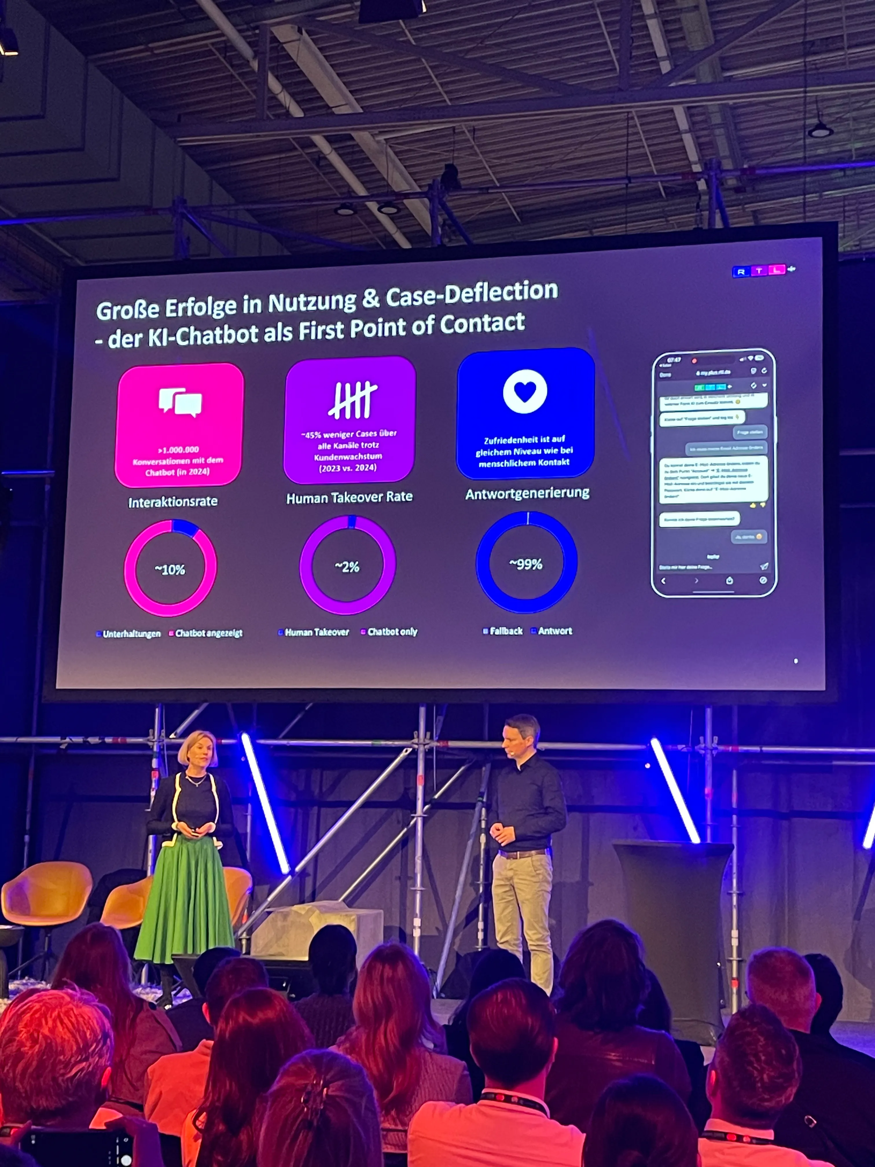 Wer letztes Jahr dabei war, erinnert sich vielleicht: Als unser CEO Ulf Loetschert gemeinsam mit RTL Deutschland auf der Bühne stand, war der Saal bis auf den letzten Platz gefüllt. Mit einer Automatisierungsquote von 98 % bei über einer Million Konversationen haben wir bewiesen, dass unsere Generative KI keine Zukunftsmusik mehr ist, sondern eine hochskalierbare Enterprise-Lösung, die messbare Ergebnisse im großen Stil liefert.